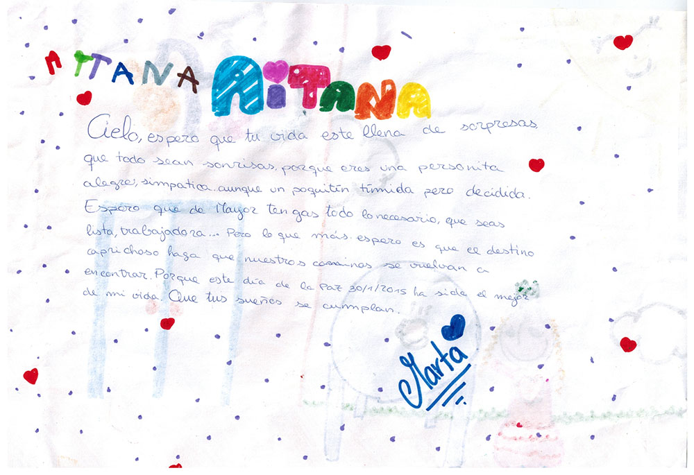 El trabajo cooperativo entre distintos niveles nos ha traído este dibujo y esta carta entre dos alumnas que se han conocido el "día de la paz".
