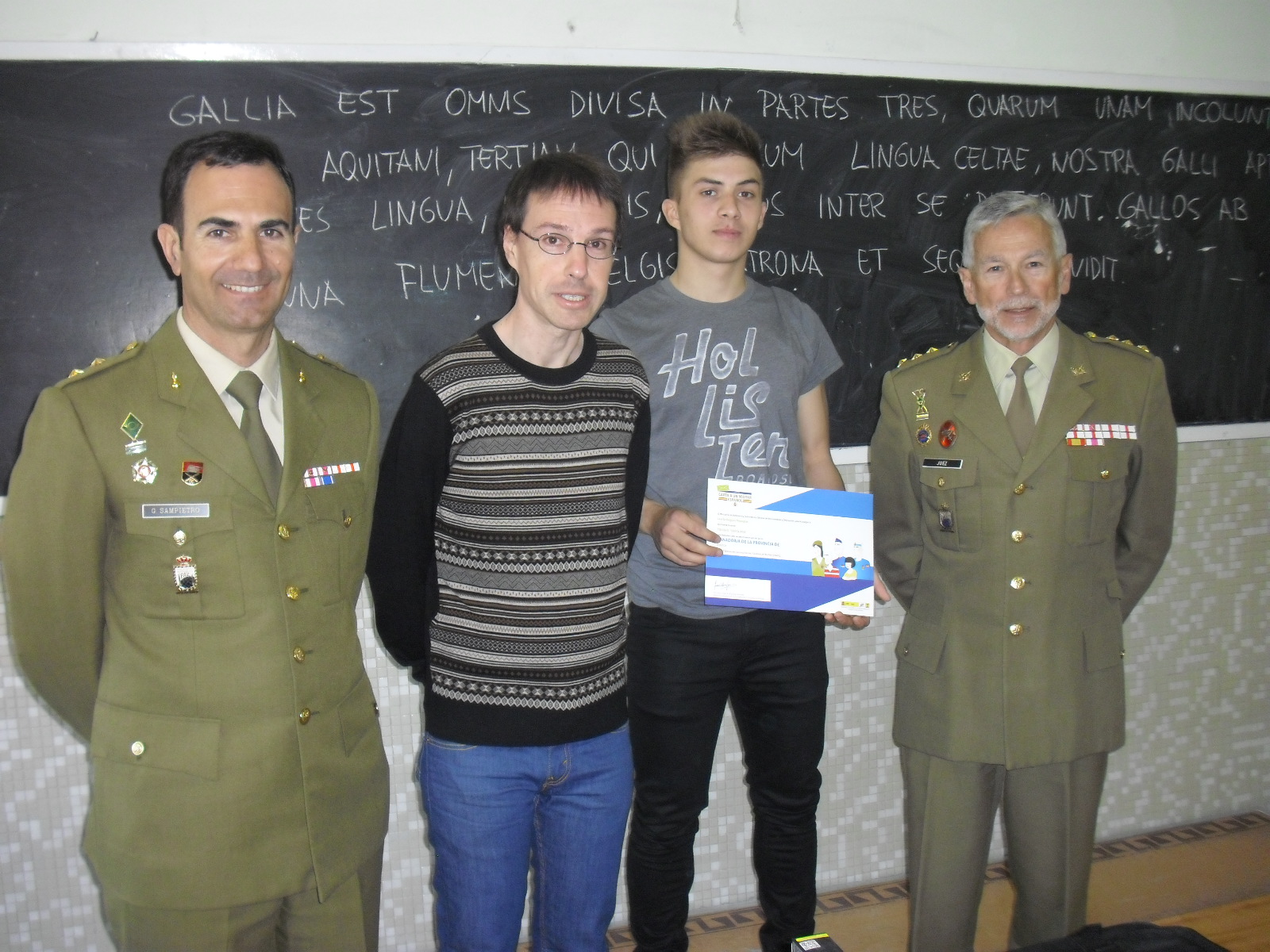Leo Rodriguez de 4º de ESO ha conseguido el premio nacional del Concurso sobre los Valores de las Fuerzas Armadas que organiza el Ministerio de Defensa. El premio, que primero fue vencedor a nivel provincial , fue entregado en las aulas de 4º de ESO al alumno acompañado del profesor de Lengua que le animó a participar. Al acto de entrega vino el coronel del cuartel de Huesca. El Madrid el día 1 de Junio el ministro Morenés le hará entrega del premio que pensamos será especialmente motivador. Enhorabuena.