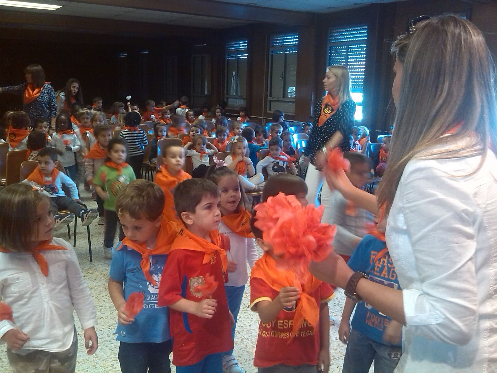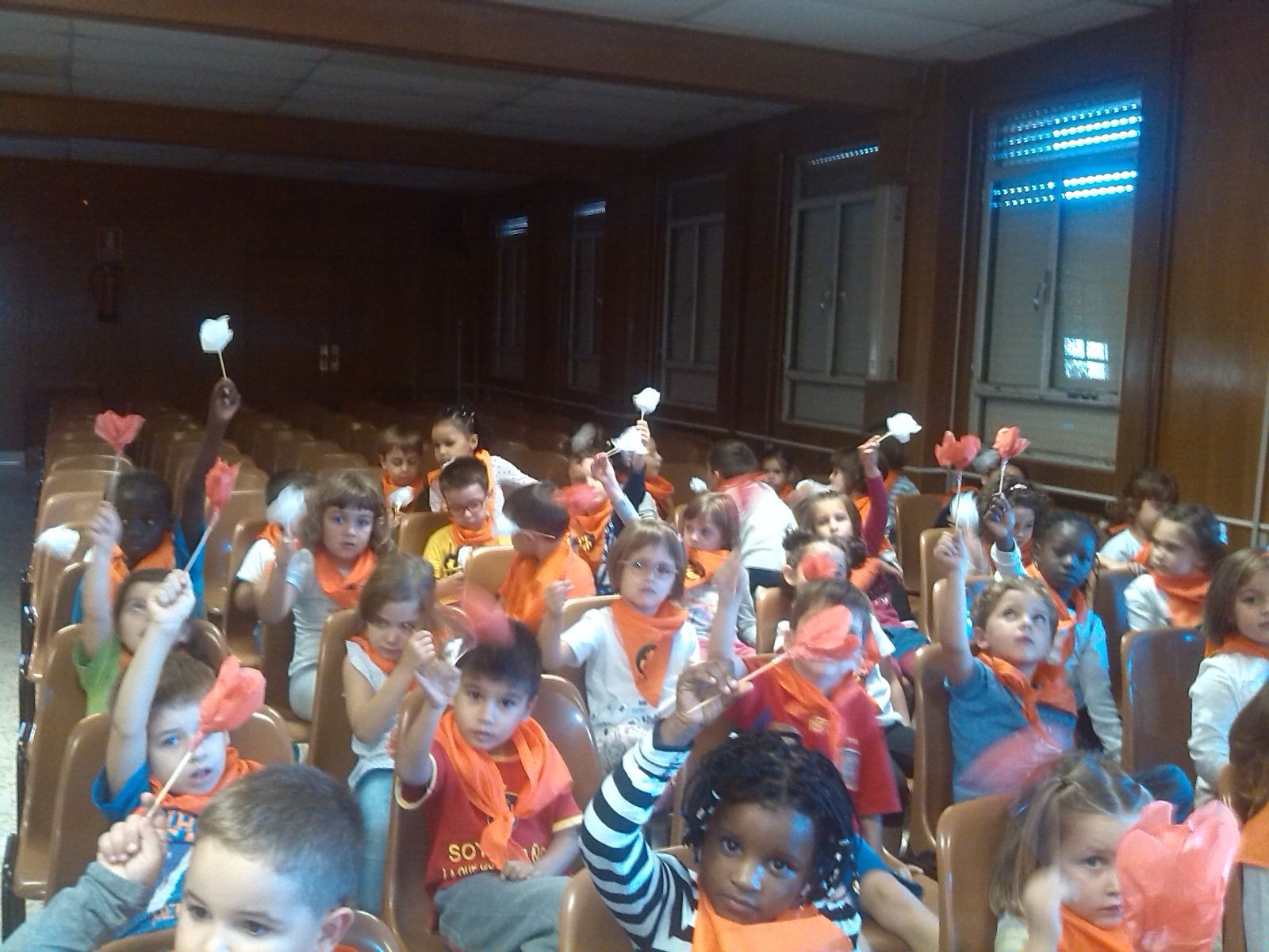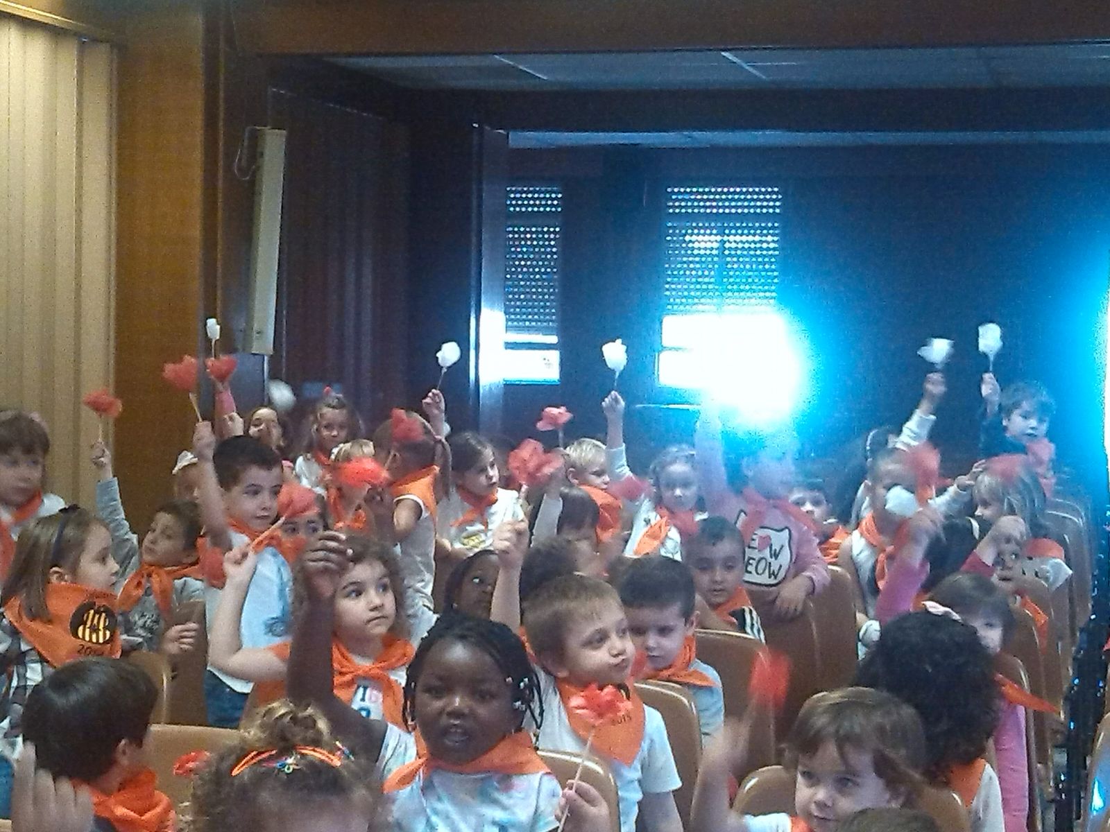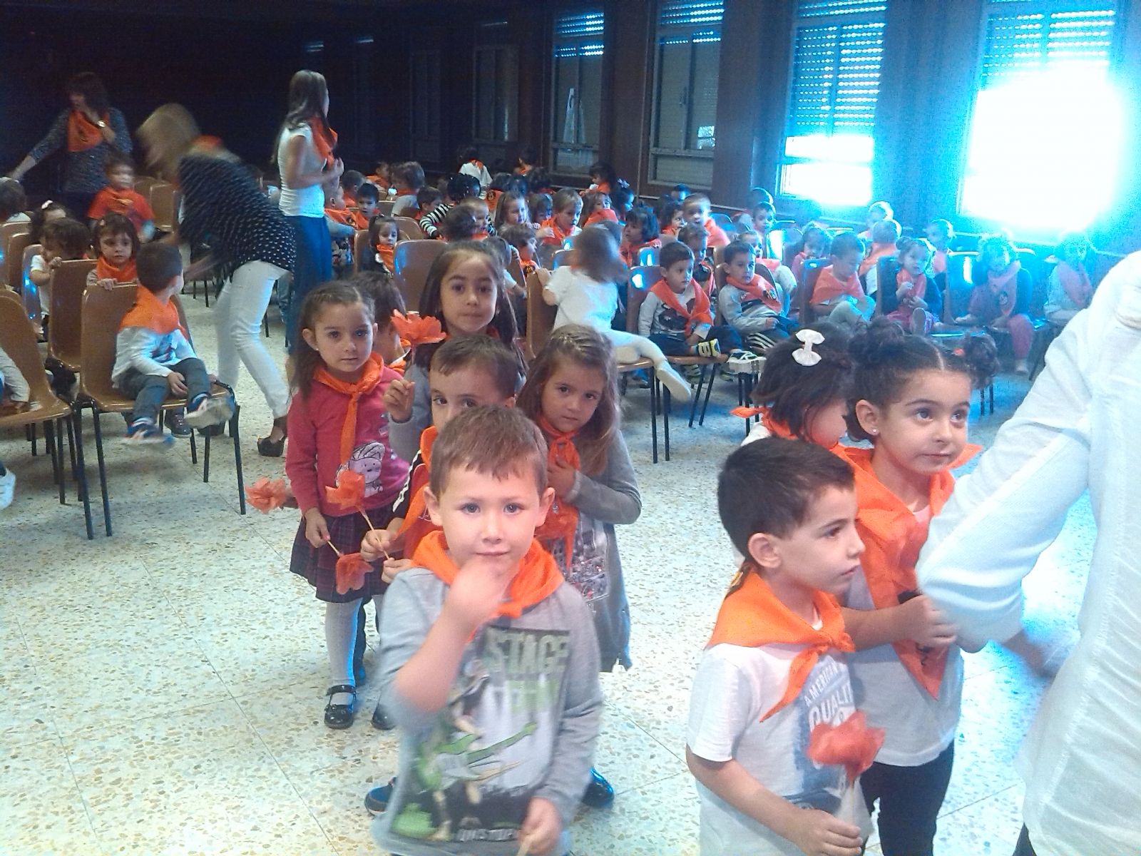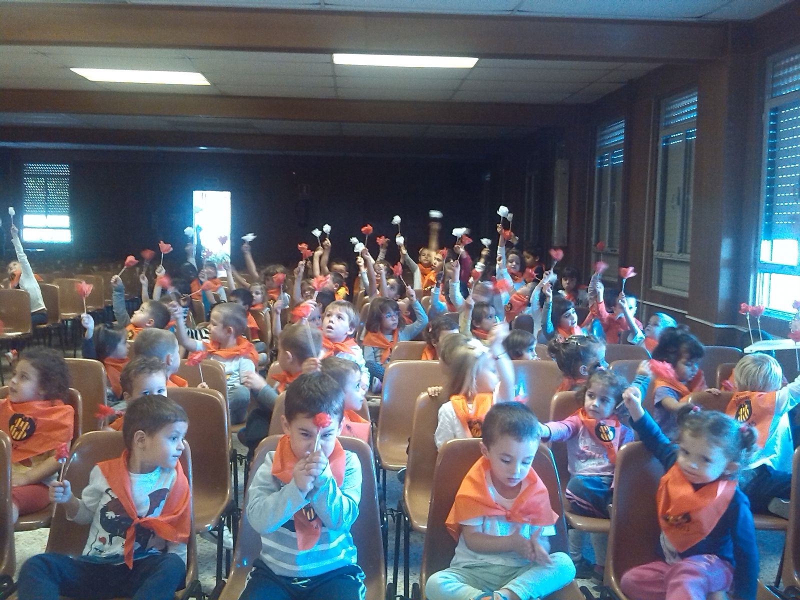 Aquí estamos todos, en el salón de actos, esperando nuestro turno para afrecer nuestra rosa a la Virgen del Pilar.