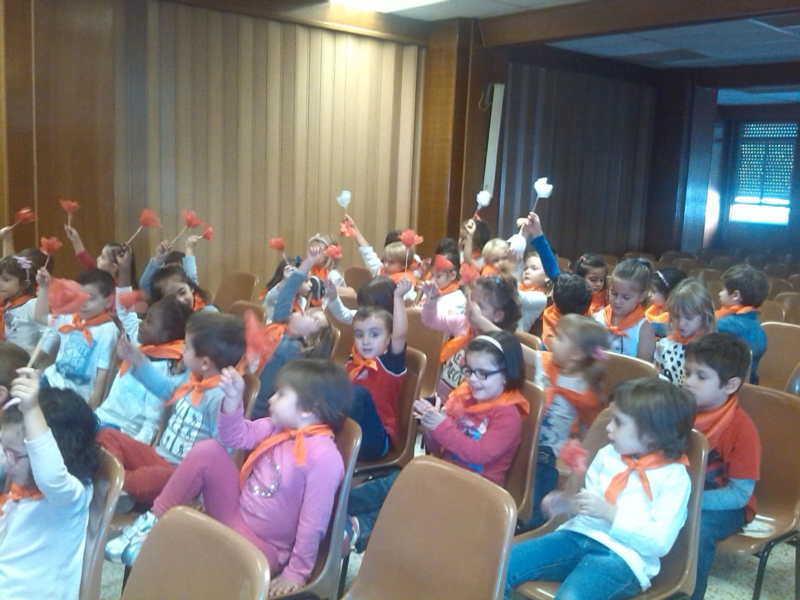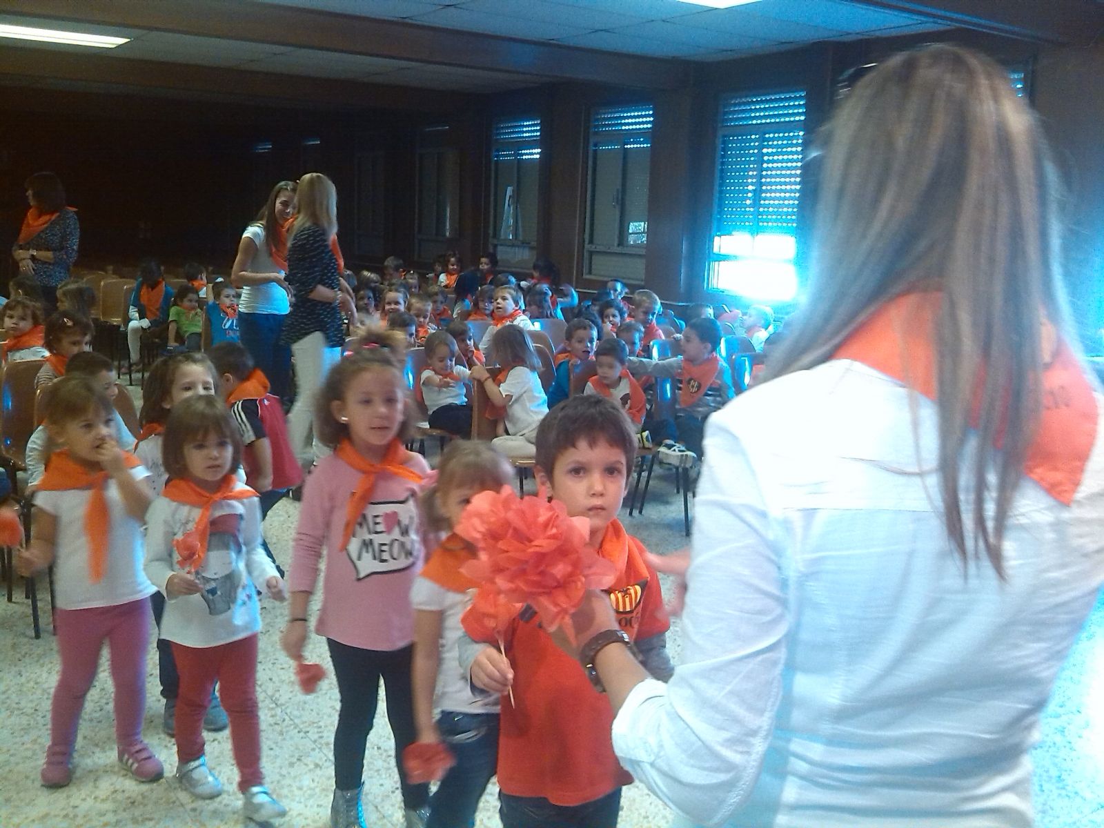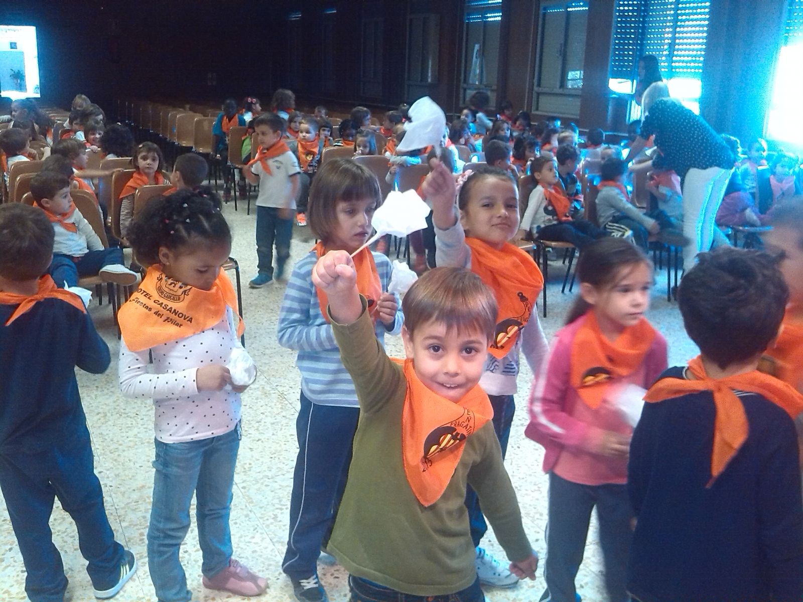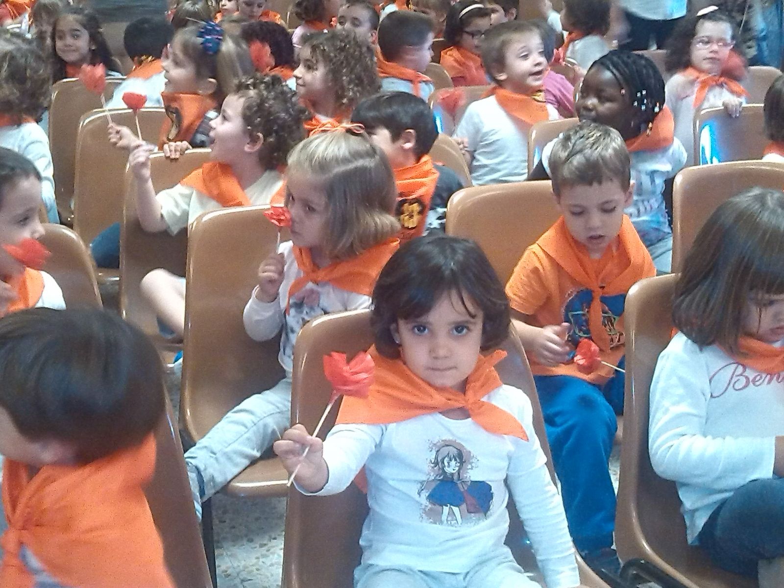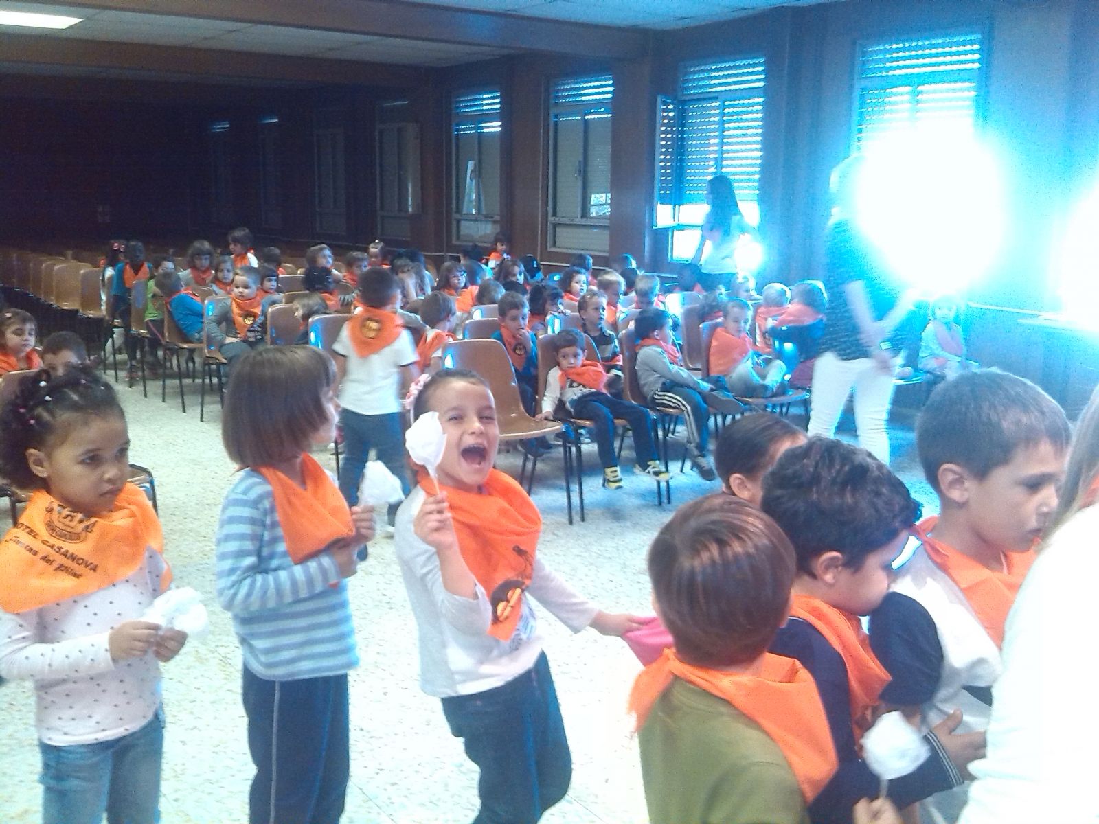 Aquí estamos todos, en el salón de actos, esperando nuestro turno para afrecer nuestra rosa a la Virgen del Pilar.