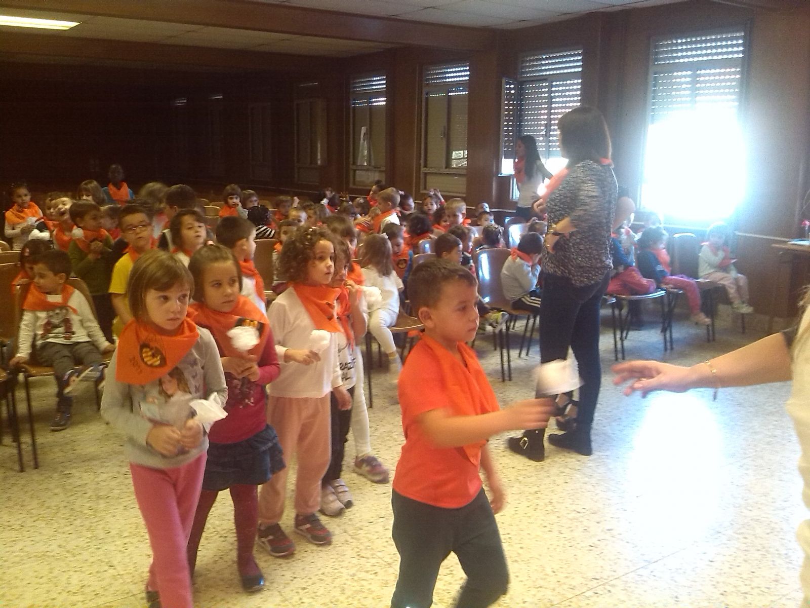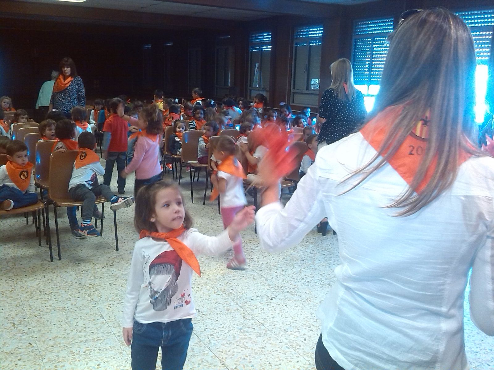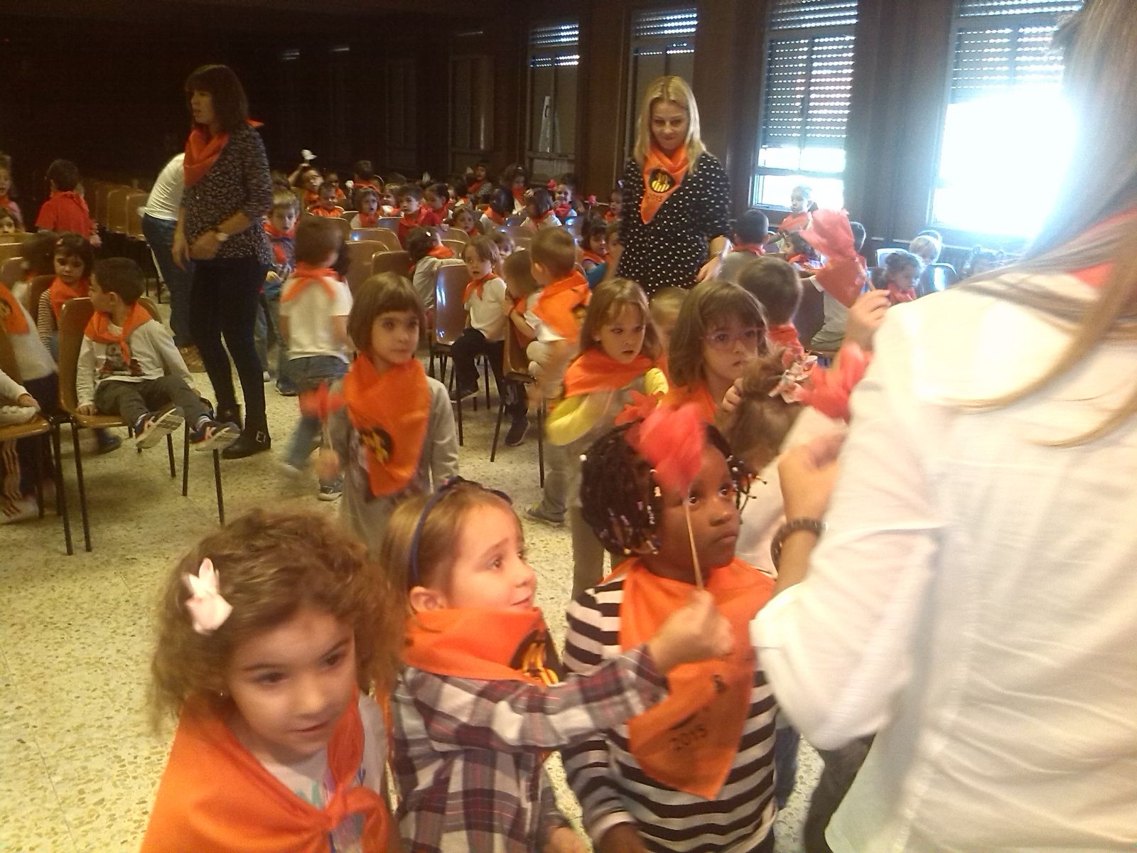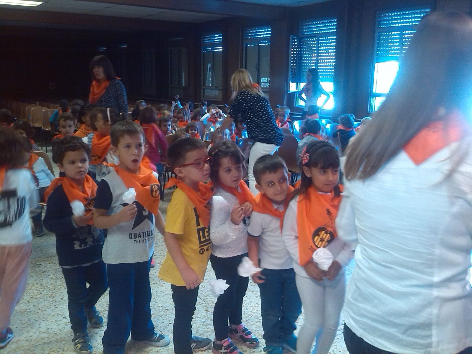 Aquí estamos todos, en el salón de actos, esperando nuestro turno para afrecer nuestra rosa a la Virgen del Pilar.