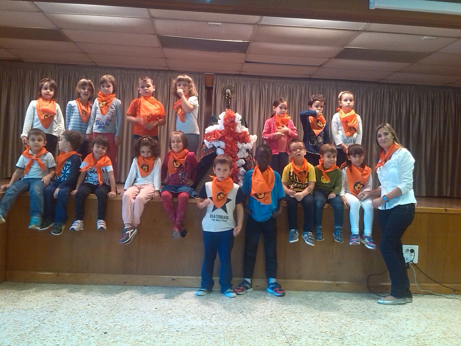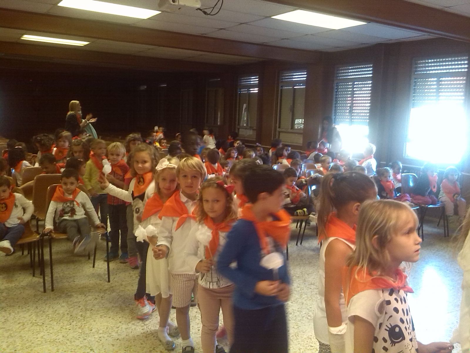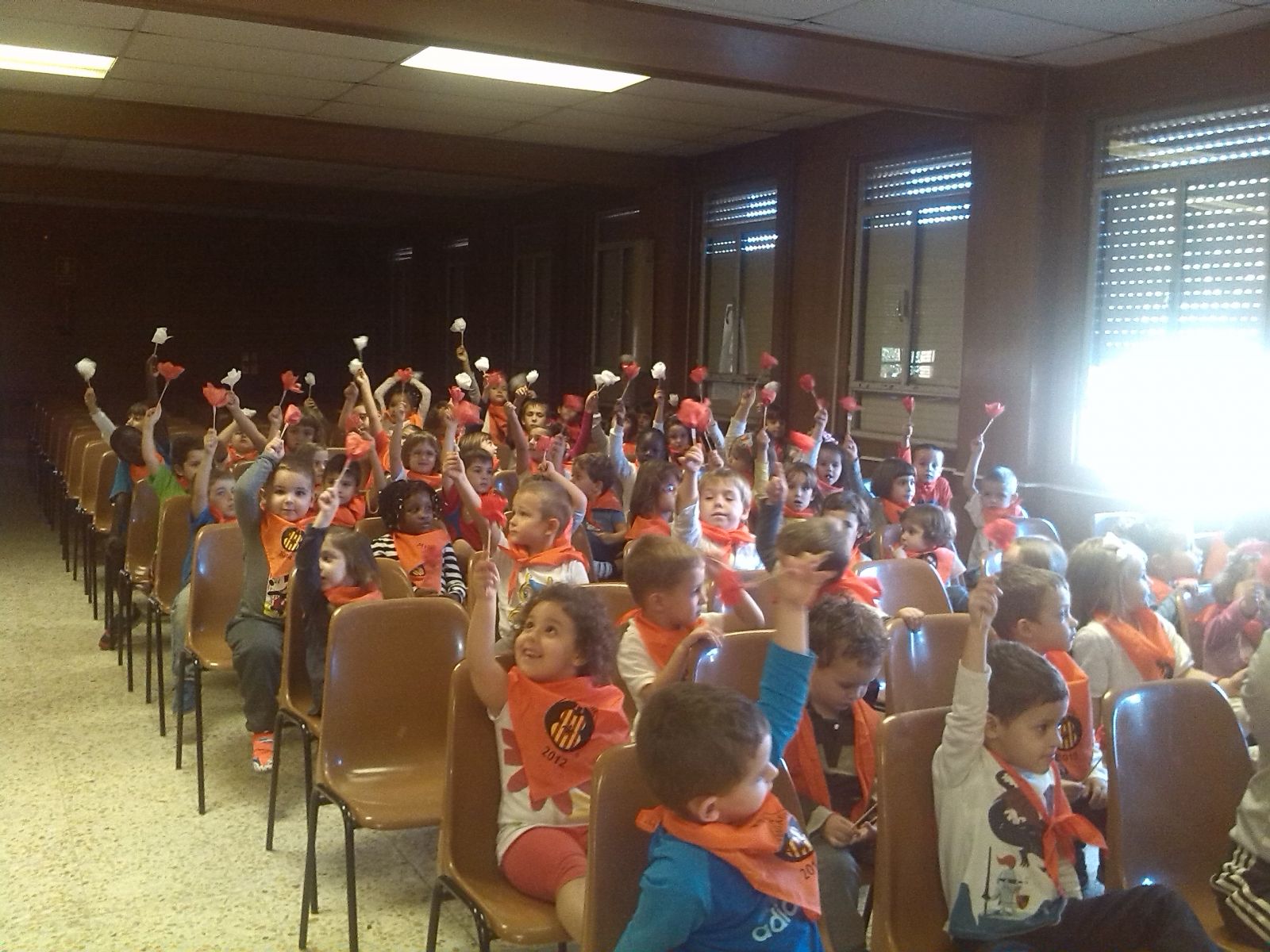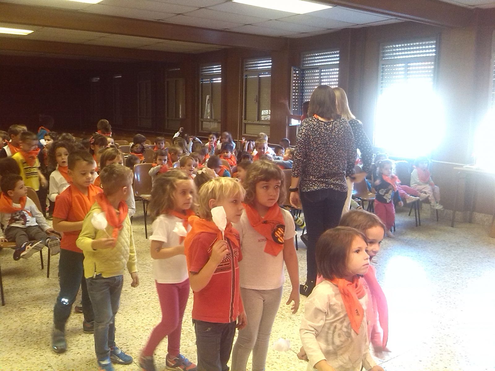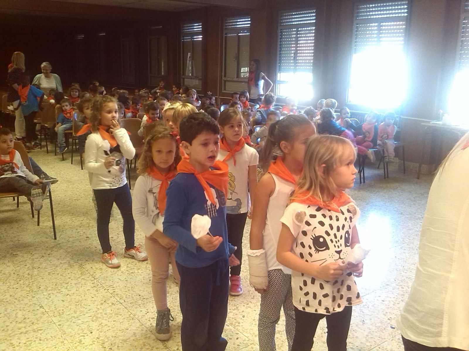 Aquí estamos todos, en el salón de actos, esperando nuestro turno para afrecer nuestra rosa a la Virgen del Pilar.