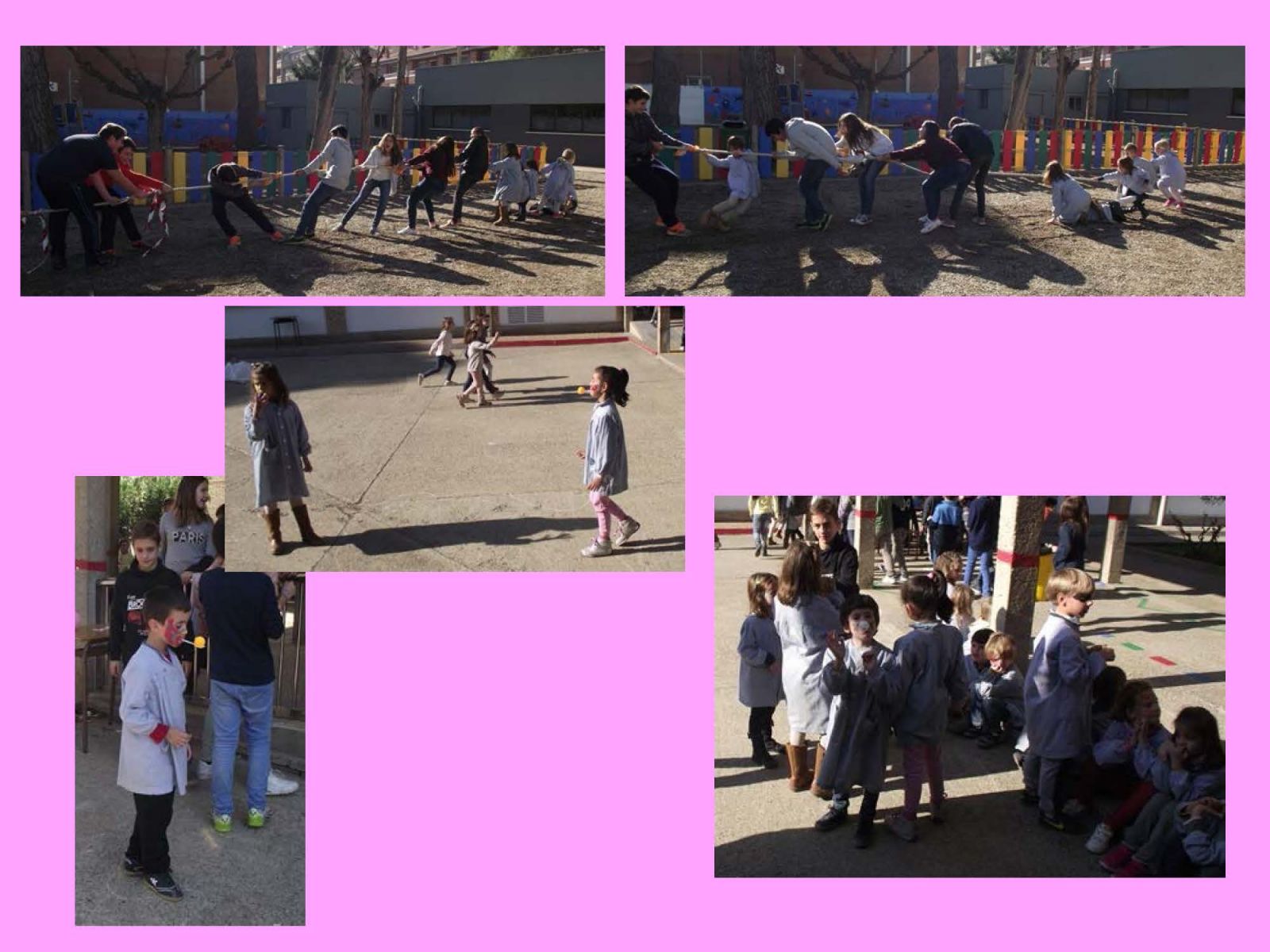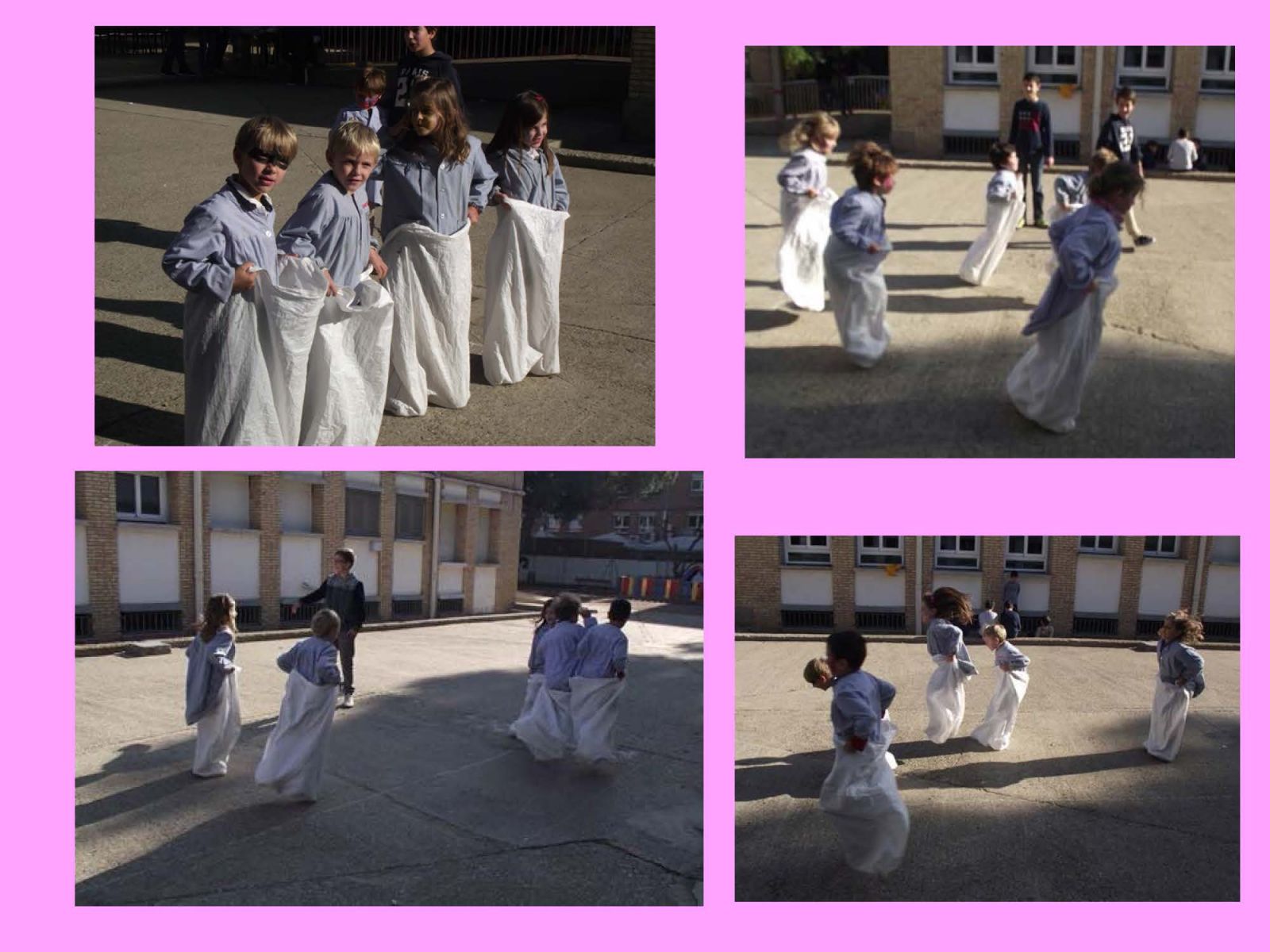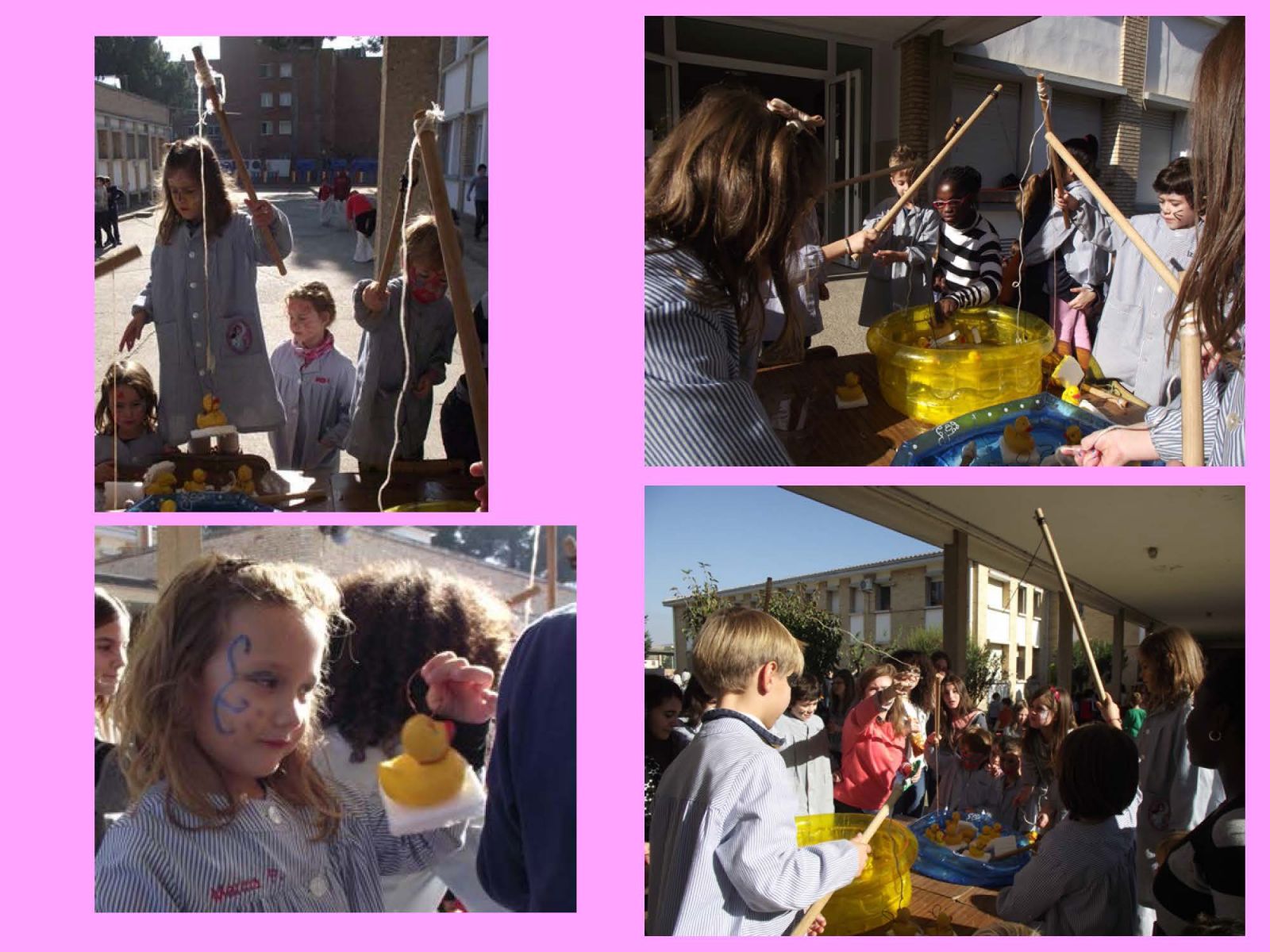 Después hemos jugado en los distintos puestos de feria realizados por los alumnos mayores (muchas gracias por vuestro esfuerzo, nos lo pasamos en grande), en donde había carreras con sacos, tiro de cuerda, pintacaras, pesca de patos, recorrido de huevos, chuches, etc. Y todo ésto solo por la mañana.