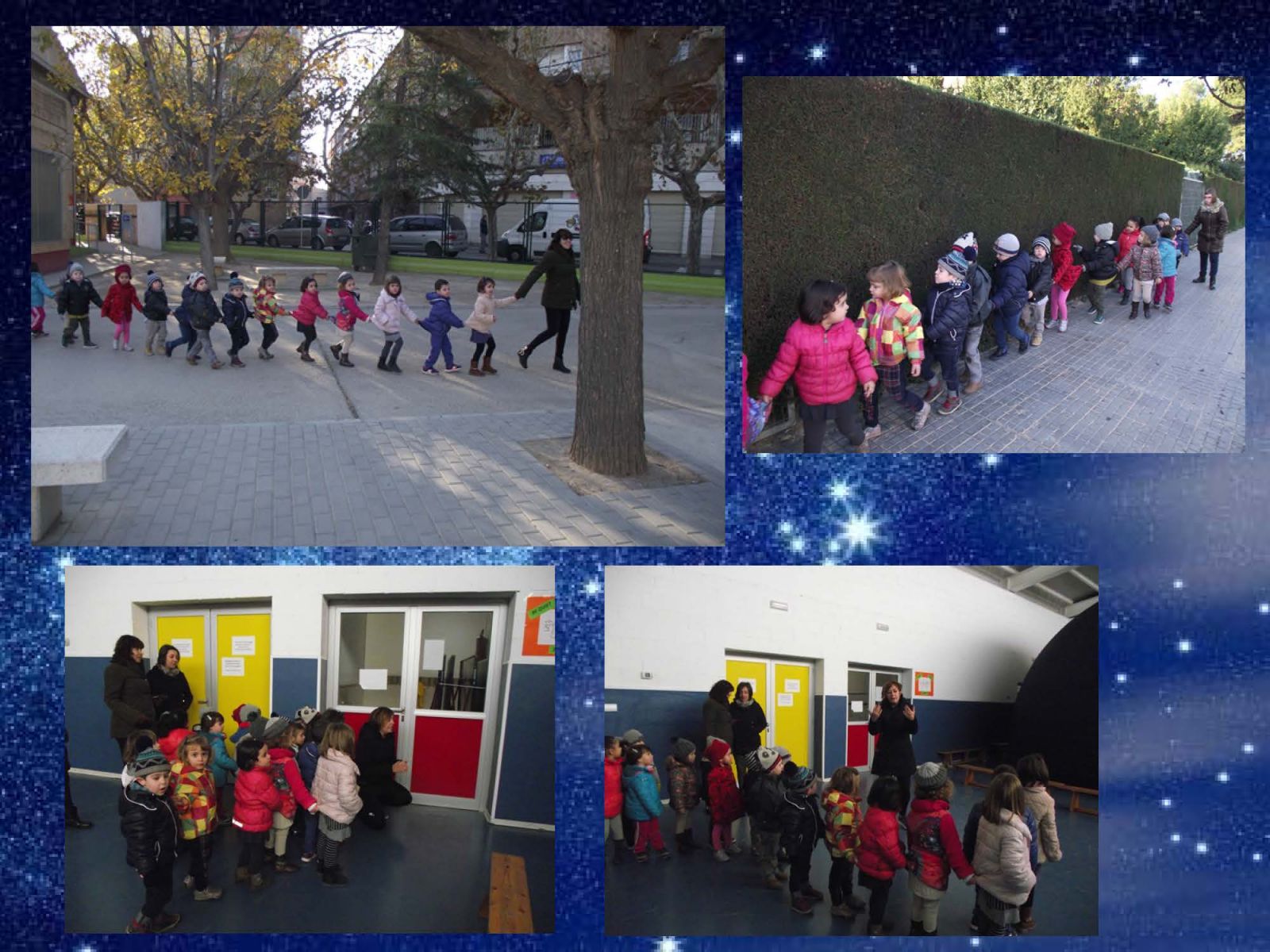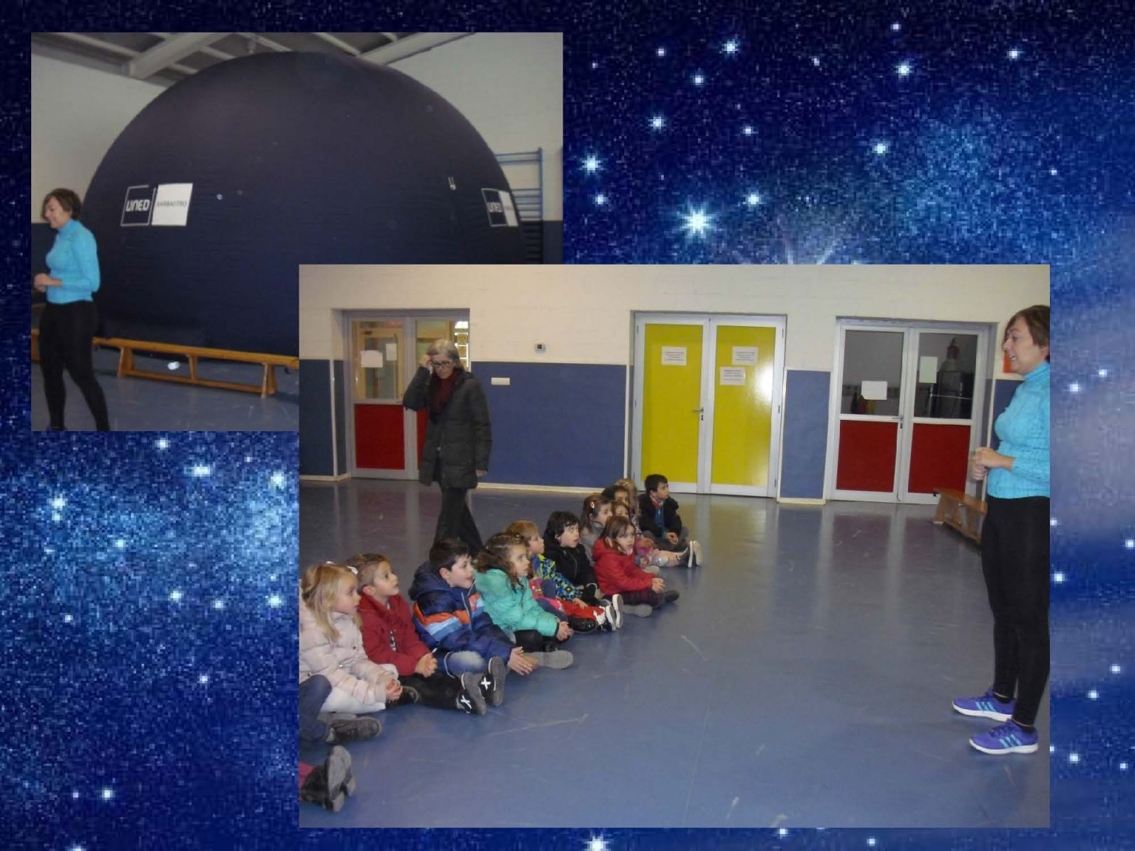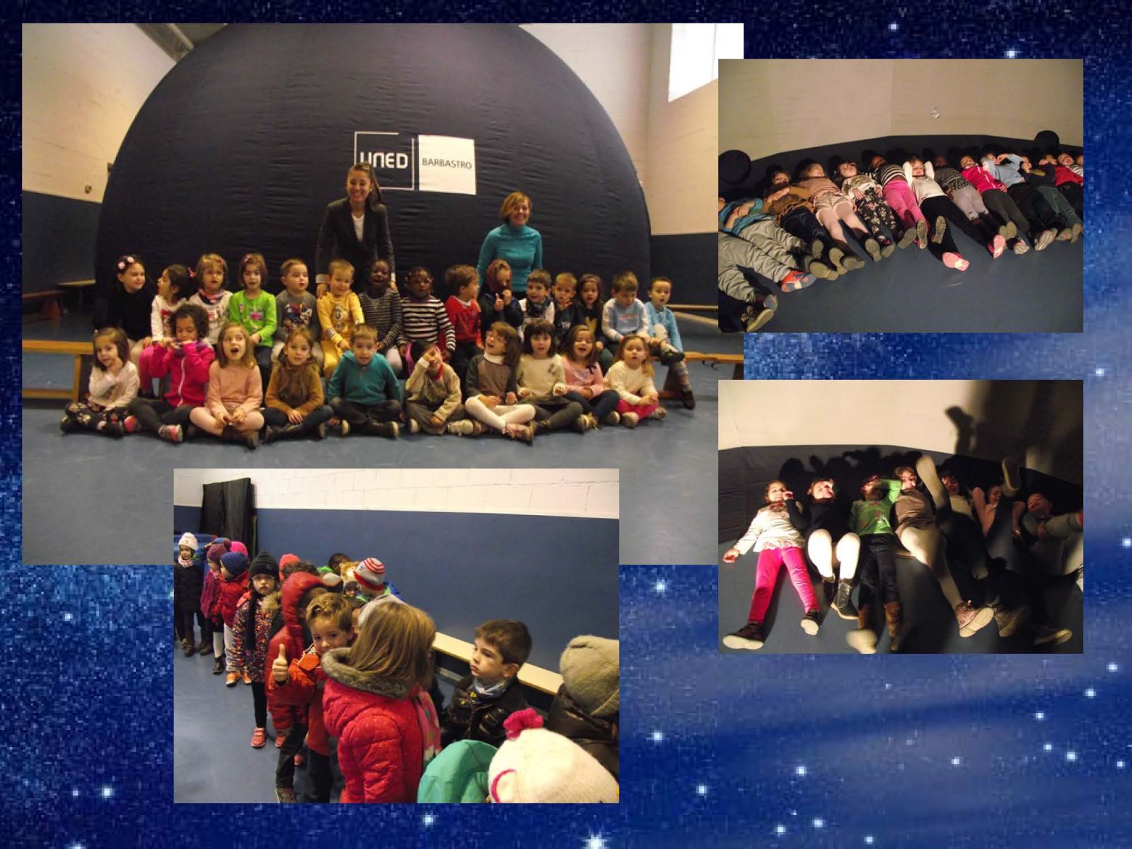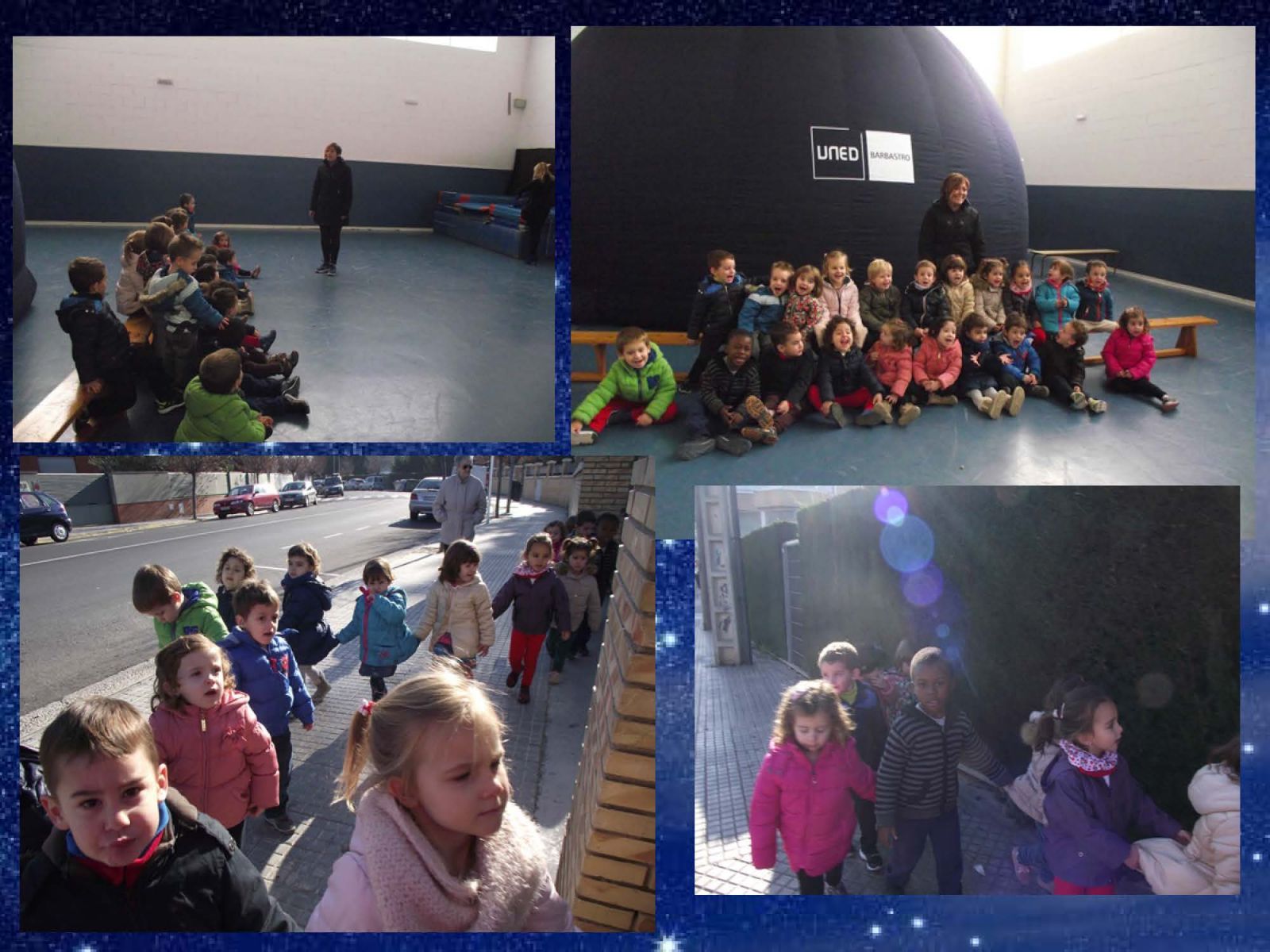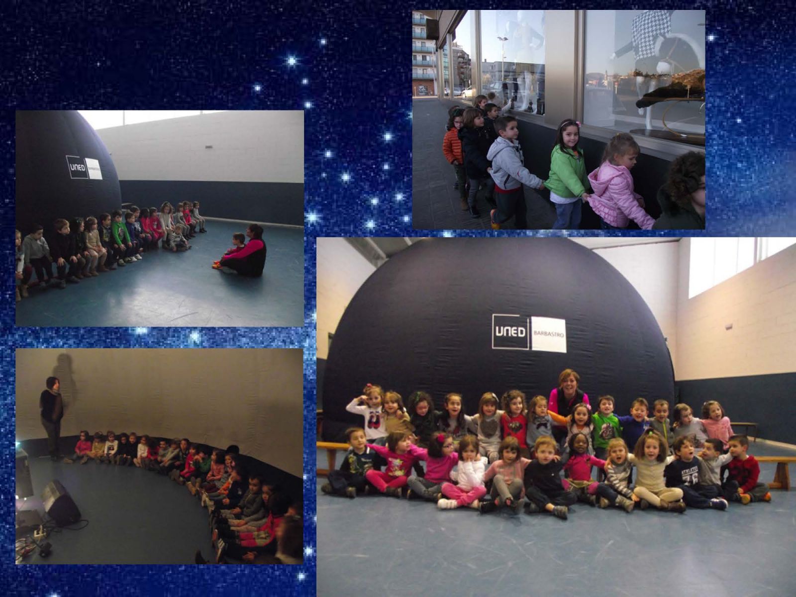 Los niños de infantil hemos tenido la oportunidad de visitar diferentes cuerpos celestes de nuestro sistema solar. Este viaje estratosférico ha sido realizado gracias al esfuerzo de varias personas de la UNED de Fraga que quieren dar a conocer las maravillas del universo, las cuales han traído su "pantalla-globo" donde hemos podido observar los fenómenos que se producen en el Sol, atravesar la atmosfera de Venus y descubrir que es un planeta más bien parecido a un horno, recorrer la superficie y los túneles de Marte, atravesar los montones y montones de meteoritos..., y también observar las constelaciones. Para que veáis cuánto nos hemos divertido os ponemos aquí algunas fotos.