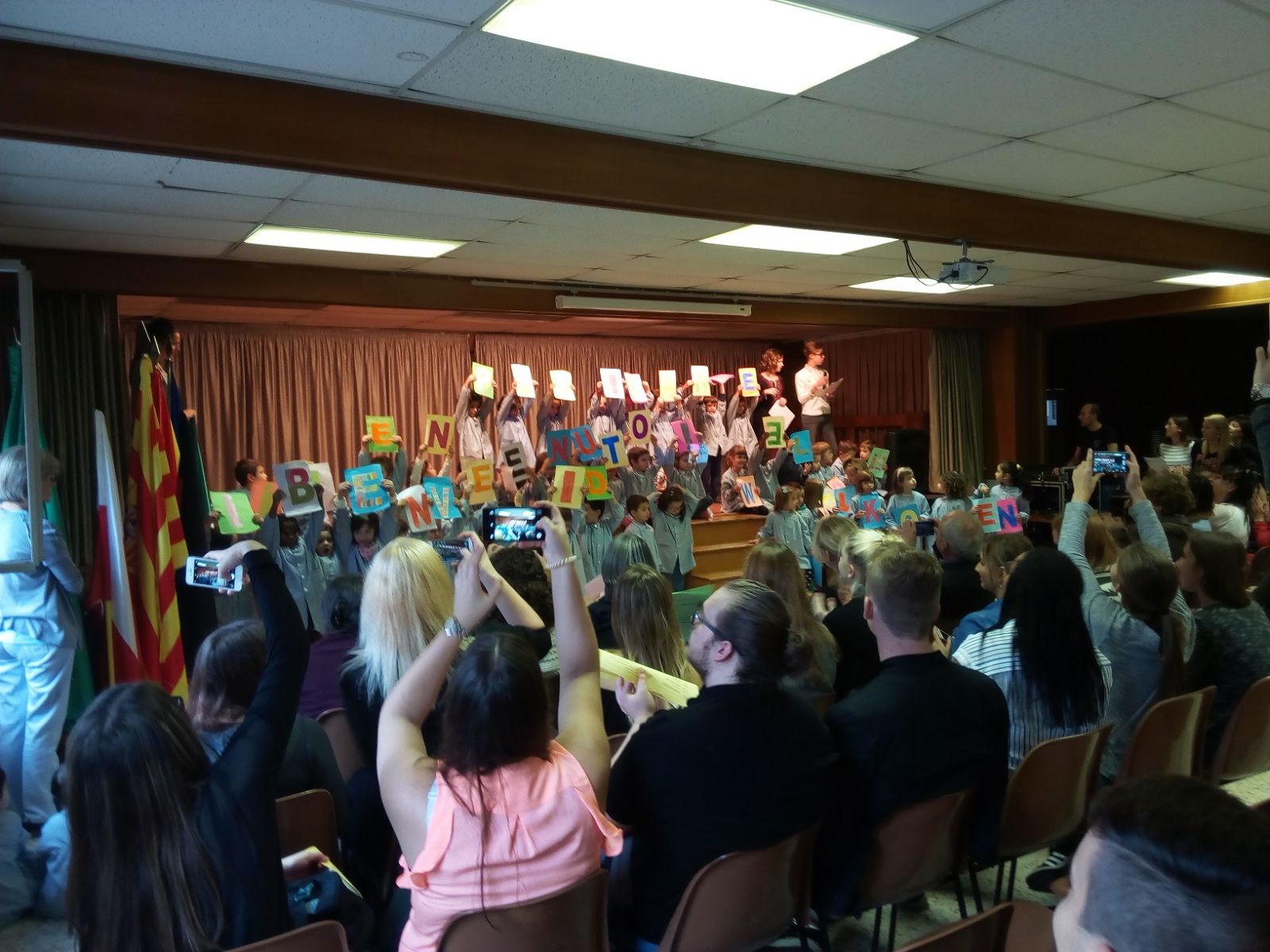 Los alumnos de infantil,recibieron a nuestros invitados europeos con banderitas, les dieron la bienvenida en sus diferentes idiomas, y les cantaron una canción en inglés: