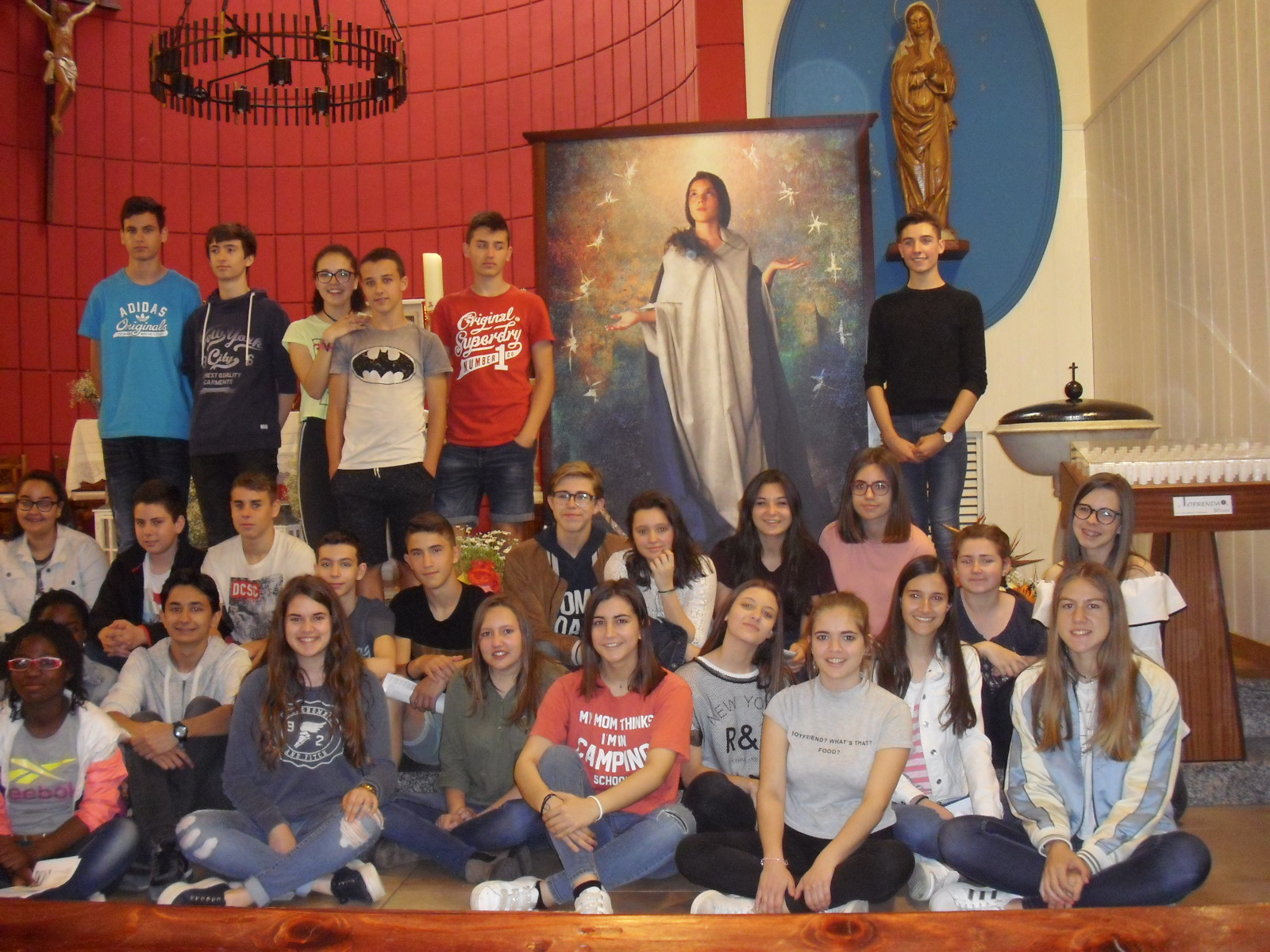Los alumnos de 4º de ESO fuimos invitados por la Parroquia a particiapr en la visita que hace por todas las Parroquias del mundo la Virgen de los jóvenes de las Jornada Mundiales de la Juventud. En el 2012 participamos también en la cruz de las JMJ en su viaje a las Jornadas de Madrid. Este bonito cuadro fue realizado por Isabel Guerra monja de un monasterio de Zaragoza, hizo también esta Virgen Inmaculada o también llamada de los jóvenes.