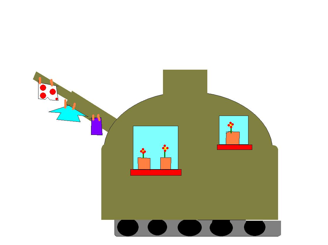 CAÑOPOMPAS: Al cañón se le han vaciado las balas por un cubo con agua y jabón. | ARCOARMAS: Las flechas son de algodón y sirven para adornar. | TANMÓVIL: Vaciamos un carro de combate y lo utilizamos de casa, el cañón para tender la ropa y abrimos ventanas para poner macetas. |