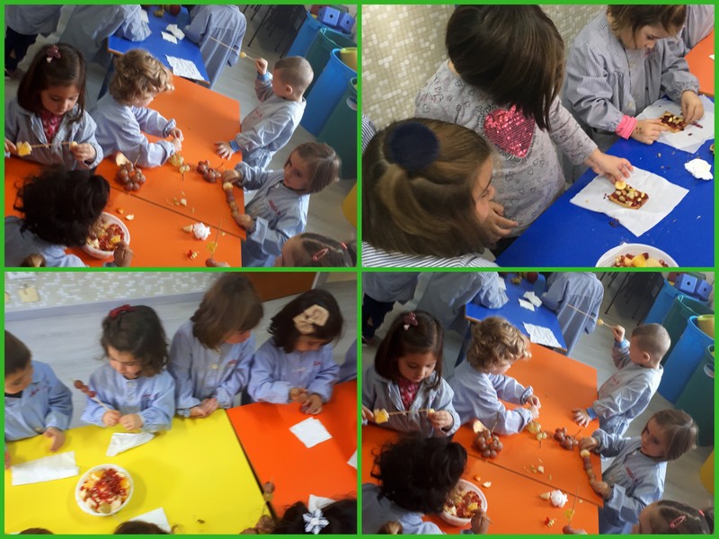 Los más pequeños de la casa confeccionaron unas brochetas muy coloridas. Pudimos trabajar la seriación aunque, para algunos, era complicado porque colocaban una fruta pero se comían tres.