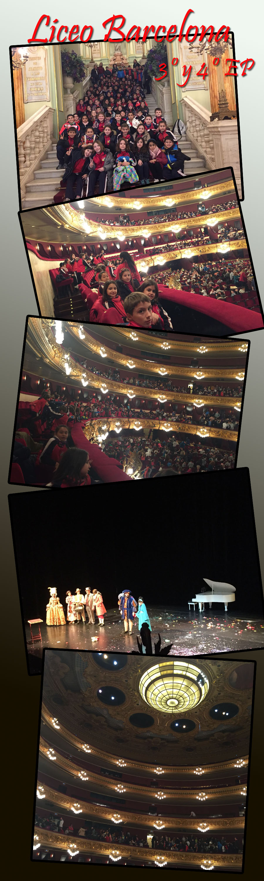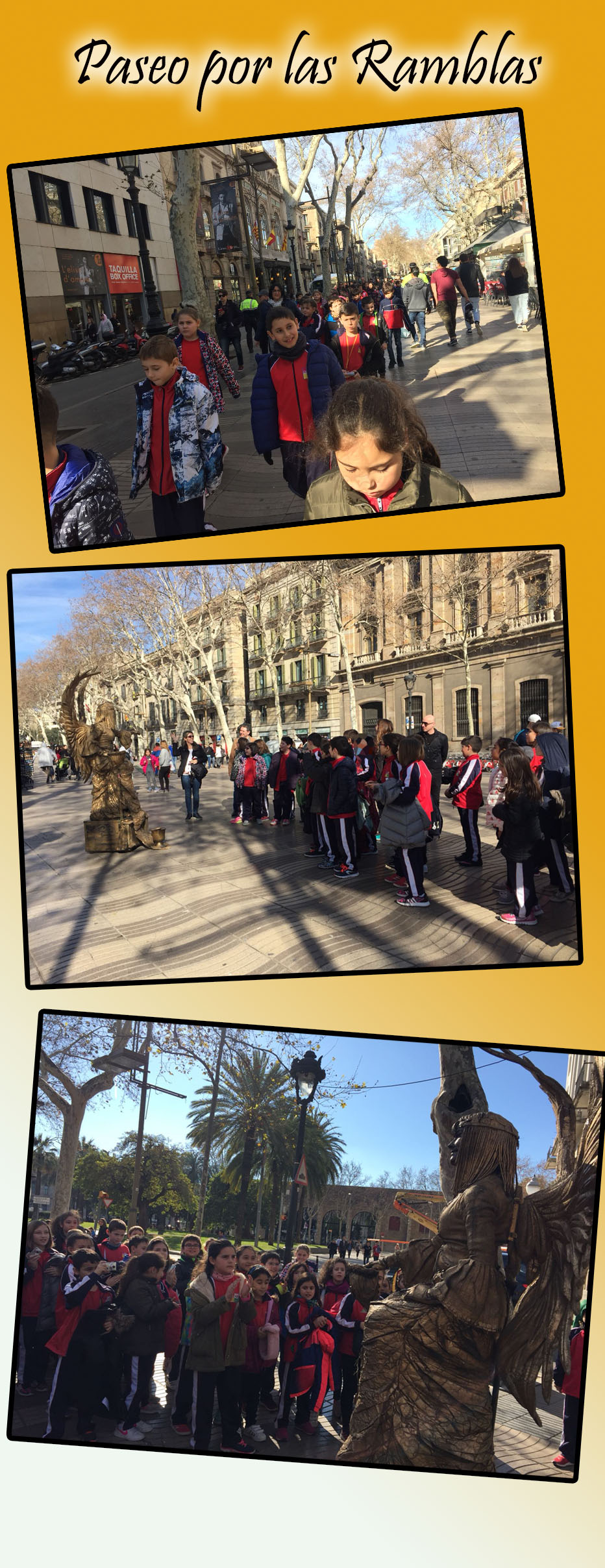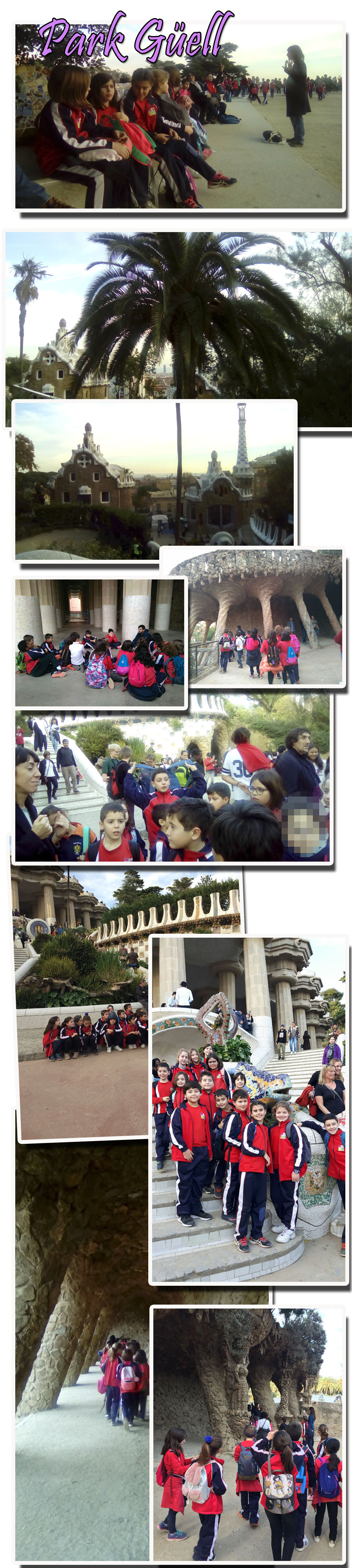 Llegamos justo a la hora de ver el teatro, una obra muy divertida y adecuada para los alumnos de 3º y 4º; luego dimos una vuelta por las Ramblas y después de comer, conocimos en primera persona el Park Gûell, algo parecido a pasear por el escenario de un cuento infantil.