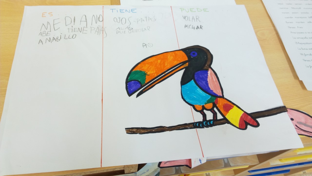 Se les ha entregado a cada grupo de trabajo un animal procedente de la selva que estamos investigando y a partir de este debían completar un organizador gráfico en el cuál se dividían 3 columnas: Es / Tiene /Puede.