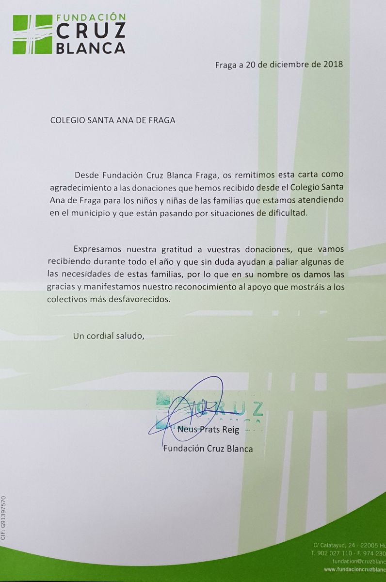 Carta de agradecimiento de Cáritas Fraga a Santa Ana Fraga