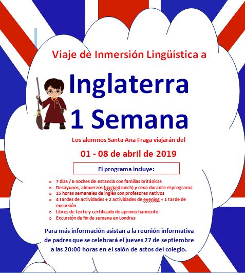 Desde el departamento de inglés estamos organizando un viaje a Inglaterra para seguir un curso intensivo de inglés y conocer mejor la cultura del país. Para poder aprovechar al máximo la estancia, durante la semana los alumnos asistirán a clases de inglés por la mañana; realizarán actividades educativas por la tarde y convivirán con una familia inglesa. La temática del programa será de Harry Potter. El programa incluye una excursión de fin de semana a Londres para conocer la capital británica de primera mano.