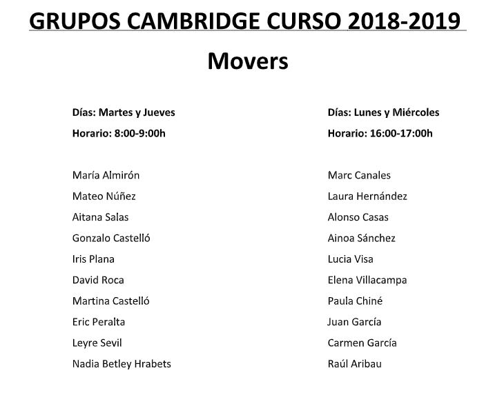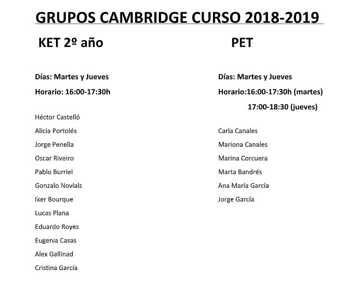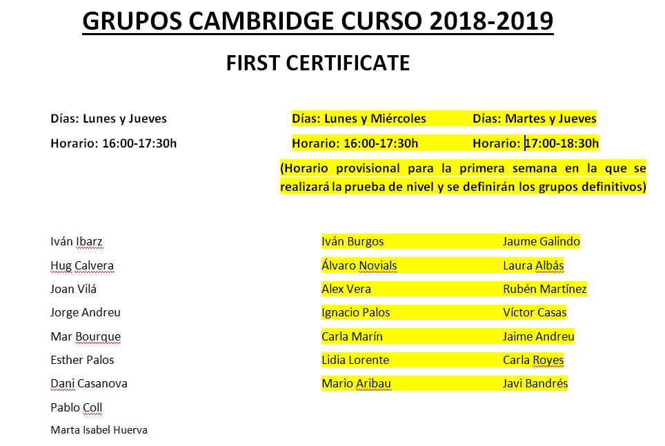 Estos son los grupos y los horarios definitivos para las clases de Cambridge. Las clases comenzarán la próxima semana (1 de Octubre).