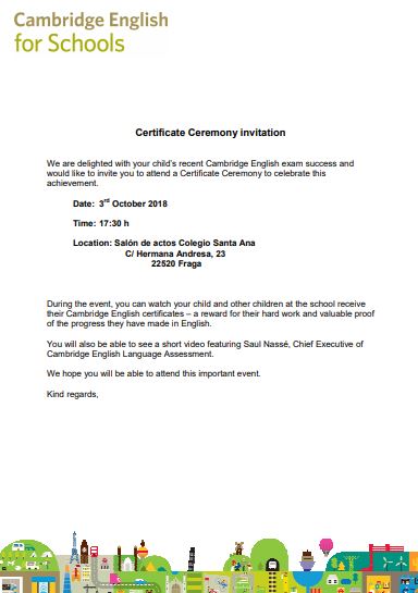 Nos complace invitarle a la Ceremonia de entrega de Certificados correspondientes a los exámenes de Cambridge realizados en el Colegio Santa Ana a lo largo del mes de junio. El acto tendrá lugar el próximo miércoles día 3 de octubre a las 17:30 horas en el Salón de Actos del Colegio.