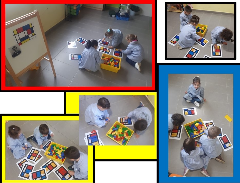 Creación: en este rincón disponíamos de diferentes plantillas, con un cuadro de Mondrian cada una, y debíamos ser capaces de recrear encima de cada una de ellas, las obras propuestas, utilizando piezas de lego. Esto nos hizo pensar mucho… ¿Cuántas piezas debería coger para hacer este cuadrado? ¿Debería llenarlo con tres piezas, he puesto 2 cuántas debería coger? Un trabajo matemático que incluso los más chiquitines del cole fueron capaces de realizar de forma intuitiva.