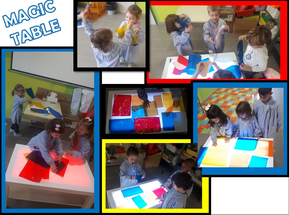Mesa de luz: utilizando papeles de los colores de nuestro artista y teniendo en cuenta distintos tamaños, formas y opacidades, en este rincón creamos un cuadro gigante. Realmente nos fascinó porque cuando poníamos papeles azules y uno amarillo encima, aparecía ¡el color VERDE! Desde entonces… más de un grupo ha decidido llamarla ¡la mesa mágica!