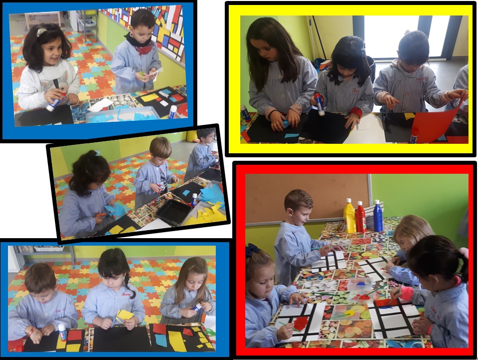Arte libre: sobre la mesa y adaptándolo a cada grupo de edad, decidimos crear nuestro cuadro inspirado en Mondrian. Así que, o bien con pintura o con la técnica del collage, hemos conseguido realizar la gran obra de nuestro nuevo autor: “Composición”