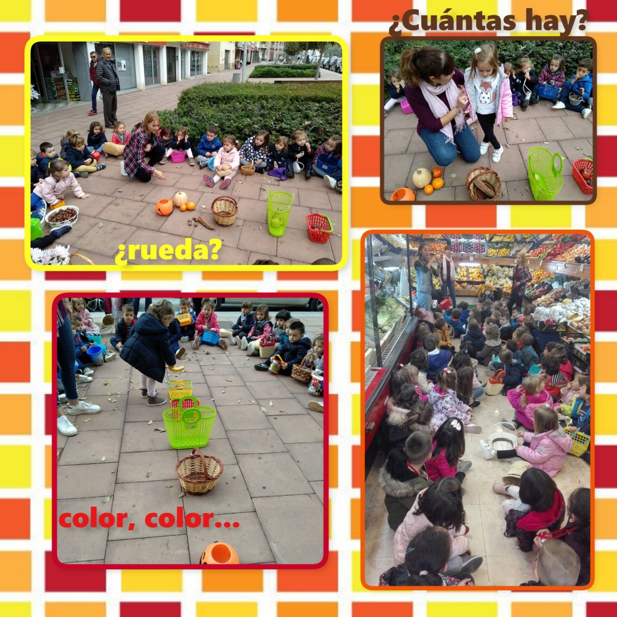 Una vez allí, después de encontrar todas las frutas que queríamos, las clasificamos por colores, comparamos su tamaño y comprobamos cuáles de ellas ruedan, incluso hicimos carreras que nos ayudaron a ser más conscientes de las características de cada una de ellas.