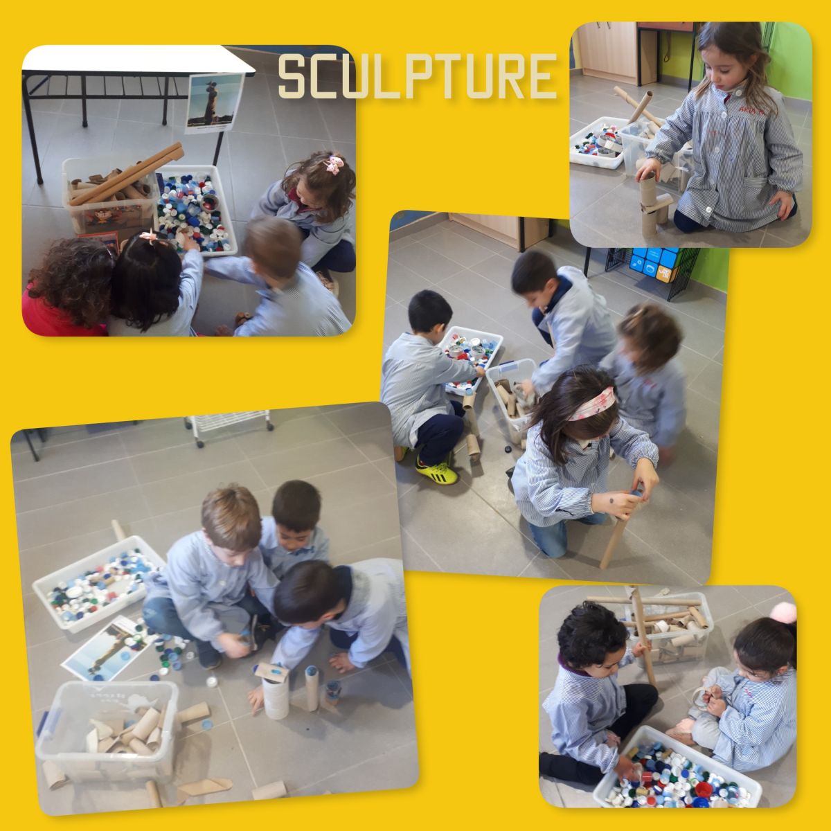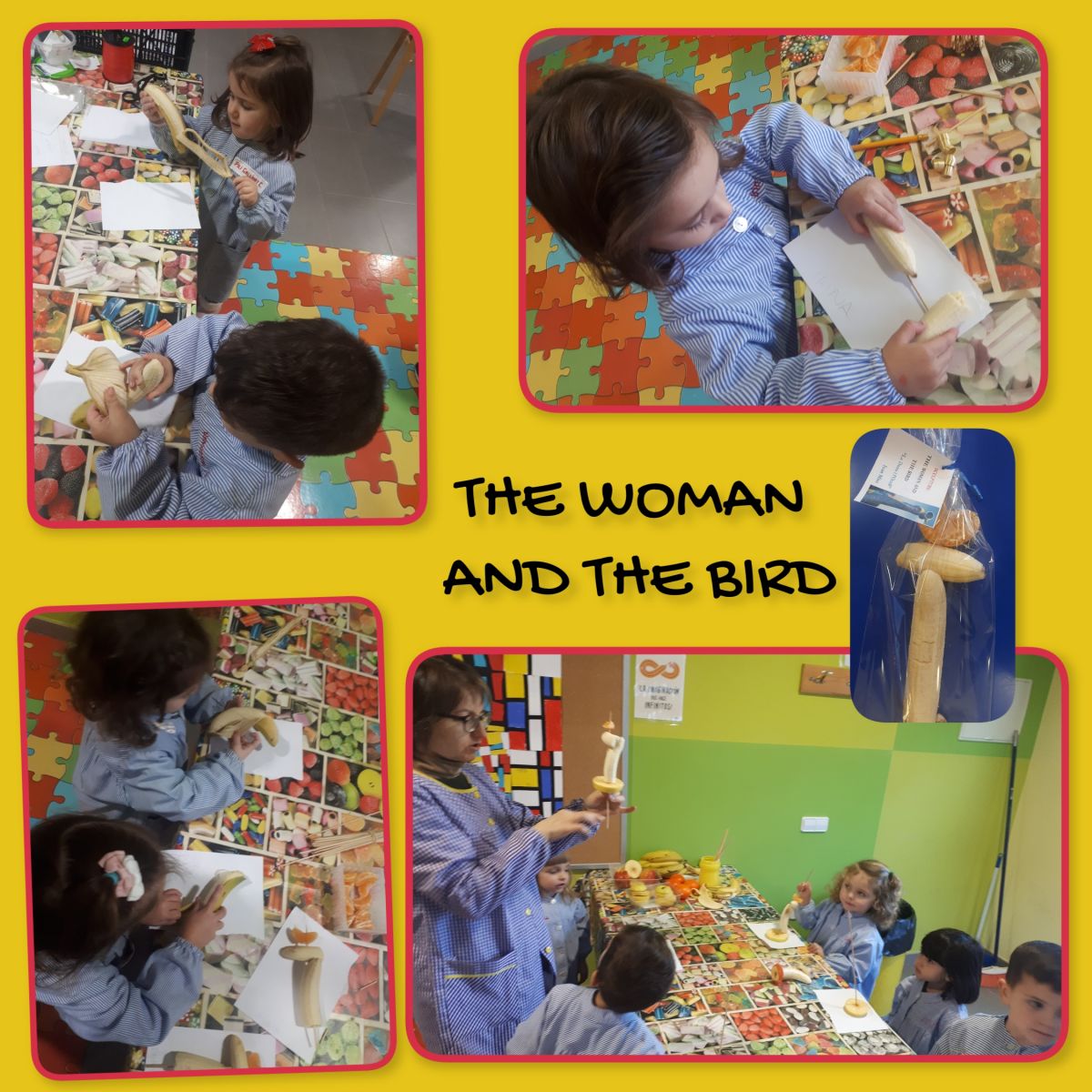 Construyendo con material reciclado una de sus obras más famosas “La mujer y el pájaro”, los tubos de cartón y tapones fueron nuestros grandes aliados; aunque, por desgracia, la gravedad no puso mucho de su parte… Por este motivo, con P3 decidimos convertirnos en escultores CULINARIOS y representar “The woman and the bird” ¡con un plátano y una mandarina!
