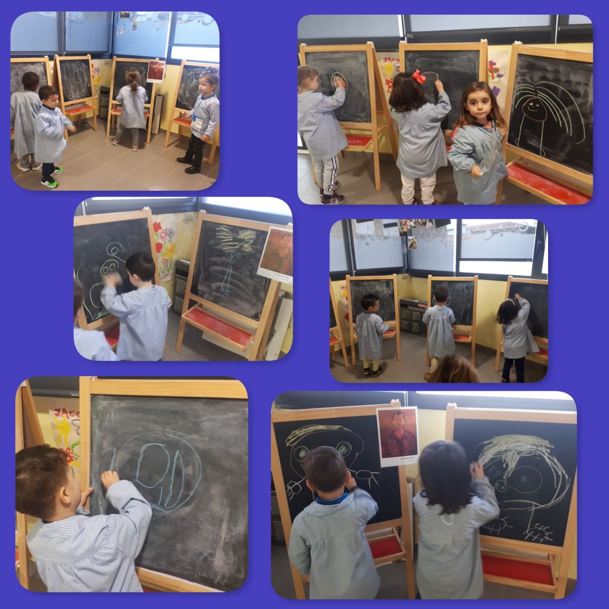 Para pintar nuestro autorretrato “SELF PORTRAIT”, como buenos artistas que somos, hemos usado los caballetes y, mientras los de P5 perfeccionaban su arte con la pintura… P3 y P4 han utilizado las pizarras, teniendo en cuenta cómo somos para dibujarnos lo más parecidos posibles.