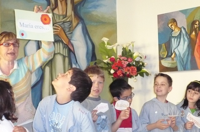 Los niñ@s de primero y segundo hemos ido hoy jueves 21 de mayo a la capilla del colegio con motivo de conmemorar el mes de María, aunque durante todo el mes, en la oración matinal se la dedicamos a la Virgen María. A final del mes de mayo organizamos una celebración en la que cada clase colabora para que entre todos se lleve a cabo:
