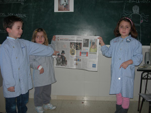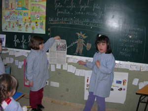 Cada semana un niño del aula recoge el periódico se lo lleva a su casa y junto con su familia eligen una noticia, unos días más tarde la explican a los demás compañeros de clase.