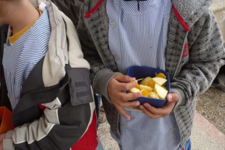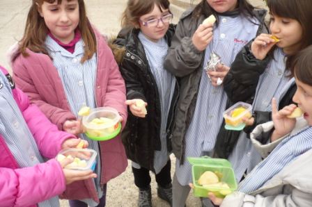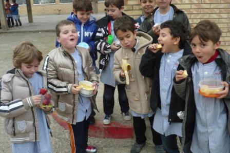 'UNA SOLUCIÓN: Siguiendo con el planteamiento del curso pasado, los miércoles es el día de la fruta en todo el 1º ciclo de E.P. Se trata de que todos comamos fruta en el desayuno del colegio, la traemos en un tupper en las mochilas. Antes de salir al patio, se establece una pequeña conversación alrededor de los beneficios del consumo de fruta diario, los alumnos hablan de la fruta que llevan y de cómo va cambiando a lo largo del curso, según la temporada. Los alumn@s que repiten siempre el mismo tipo de fruta, se les va animando a probar otras distintas.