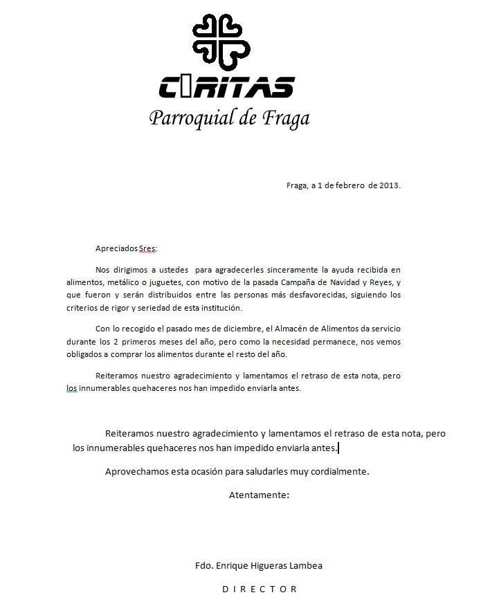 Cáritas nos remite esta carta de agradecimiento por la recogida de alimentos, juguetes y metálico en la campaña de Navidad de 2012.