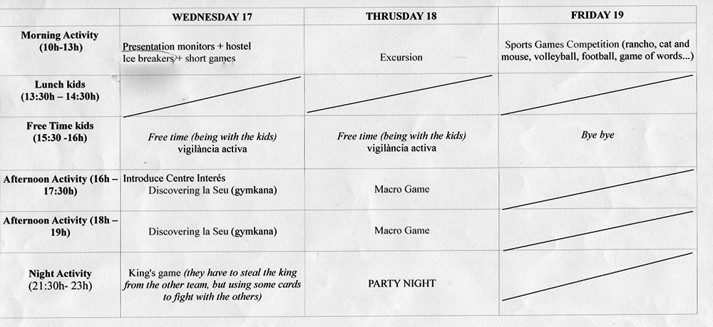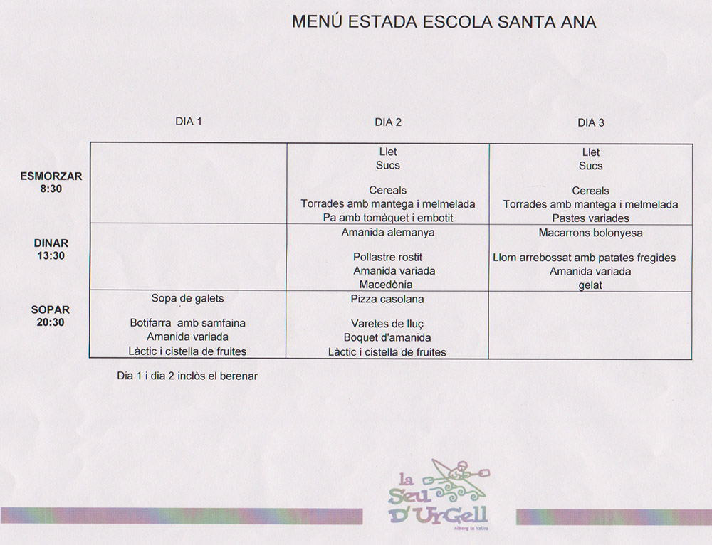 Nos esperan tres días de intensa actividad y de inmersión lingüística en Inglés. Este año el albergue que nos espera es el de La Seu d'Urgell, "La Valira" y para ir haciéndonos a la idea, os dejamos el programa de estancia y el menú.